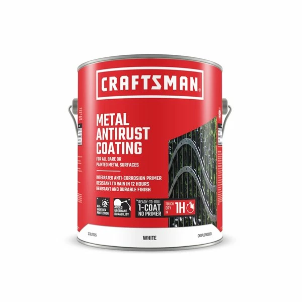 The Craftsman metal antirust coating is suitable for all bare or painted metal surfaces. The integrated anti-corrosion primer resists rain in 12 hours and provides a tough, durable finish.