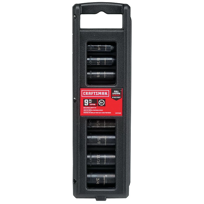 This socket set by Craftsman® features a black oxide finish for corrosion resistance and large markings to help you quickly identify the sockets you are looking for. Also, the 6-point socket design allows for increased torque due to a larger contact surface. Sockets meet or exceed ASME specifications. This set includes 9 deep sockets: 1/4″, 5/16″, 3/8″, 7/16″, 1/2″, 9/16″, 5/8″, 11/16″, and 3/4″. This product is backed by the Craftsman® full lifetime warranty.