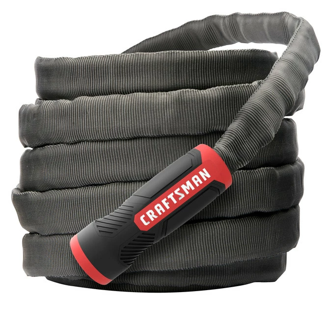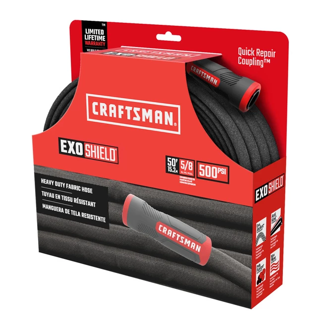 This Craftsman(R) garden hose is easy to store and can withstand high pressures and any outdoor condition thanks to its ExoShield(TM) coating made of heavy-duty fabric. It is sold here in 50′ lengths.
