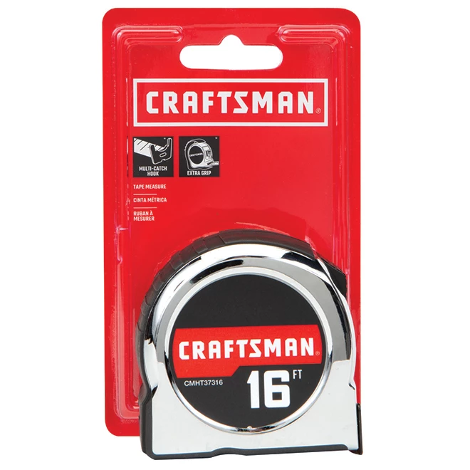 The 16′ (4.8 m) updated Craftsman® classic measuring tape features a modern rubber over mould for added grip. The multi-catch hook allows you to grab onto surfaces from either the top or bottom and the 1” (2,5 cm) wide blade provides an excellent balance between large, easy to read numbers and overall product weight. The tape is protected by a lacquer coating to prevent blade damage and increased durability.