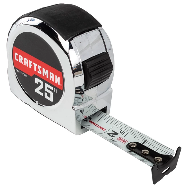 The 25′ (7.62 m) updated Craftsmanยฎ classic measuring tape features a modern rubber over mould for added grip. The multi-catch hook allows you to grab onto surfaces from either the top or bottom and the 1” (2,5 cm) wide blade provides an excellent balance between large, easy to read numbers and overall product weight. The tape is protected by a lacquer coating to prevent blade damage and increased durability.