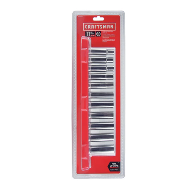 This socket set by Craftsman® features a polished full chrome finish for corrosion resistance and large markings to help you quickly identify the sockets you are looking for. Also, the 12-point socket design allows for quick engagement with fasteners, ideal for lightweight jobs. Sockets meet or exceed ASME specifications. This set includes 11 standard sockets: 10 mm, 11 mm, 12 mm, 13 mm, 14 mm, 15 mm, 16 mm, 17 mm, 18 mm, 19 mm and 21 mm. This product is backed by the Craftsman® full lifetime warranty.