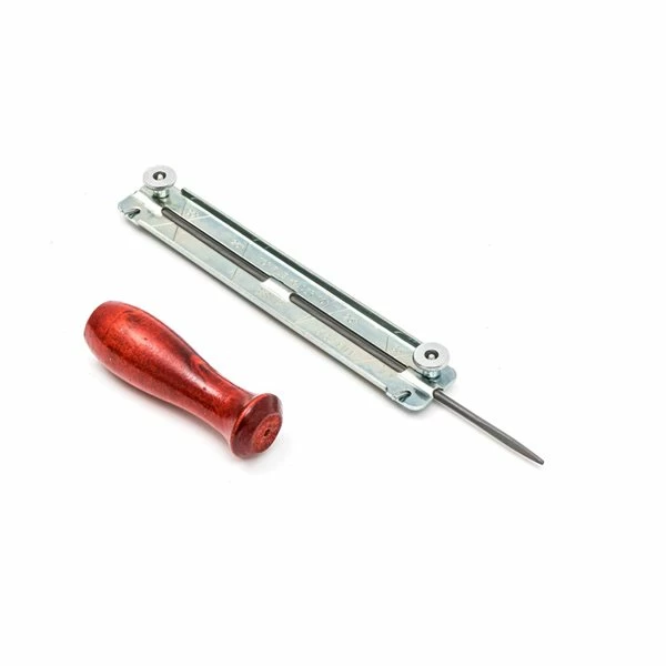 The chrome file guide enables you to sharpen the chain at the correct angle for optimum cutting performance. The precision spiral cut design provides clean, fast sharpening without scoring the cutter surfaces. The thumbscrew enables you to securely mount the file to the guide without movement during use.
