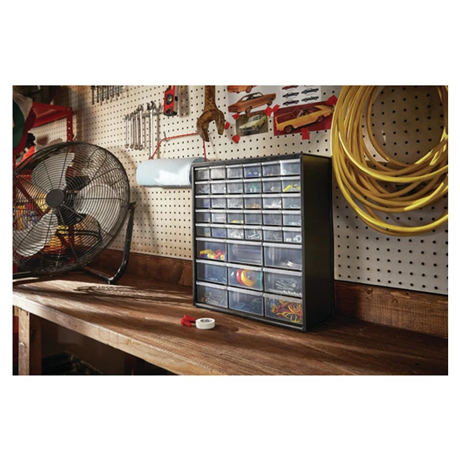 Properly store your small parts and items thanks to this 39-drawer organizer by Craftsman®. Its structure is made of heavy-duty polypropylene for an increased lifetime while the drawers are made of transparent plastic for increased visibility and a quick access to the items you’re looking for. Also, it can be wall-mounted to clear up floor space or placed on a workbench, and multiple organizers can be stacked to form a fully modular storage system which is certain to suit your storing needs. This product is backed by a 1-year limited warranty.