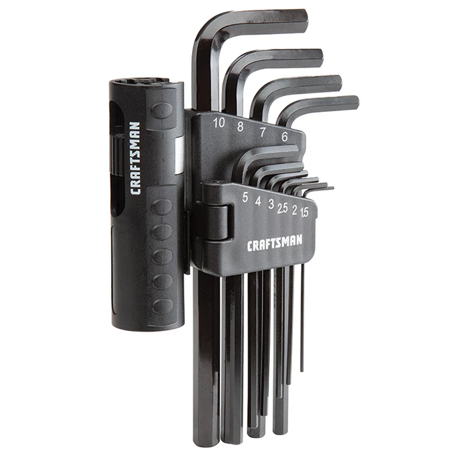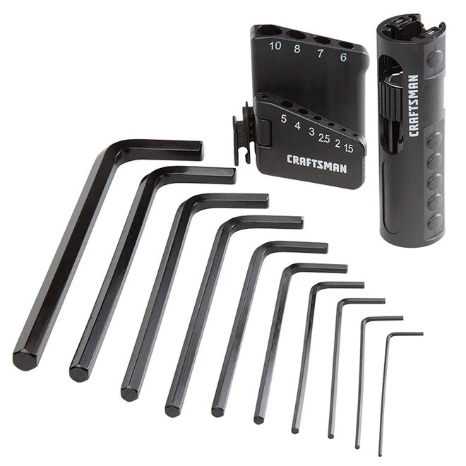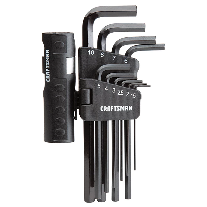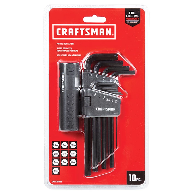 This Craftsman® hexagonal key set is made of strong steel with black oxide coating. Equipped with a convenient rack for keys and handle that keeps this set contained in your toolbox. The durable handle makes L key into comfortable T handles. This set includes a rack a handle as well as 10 keys ; (1.5) (2) (2.5) (3) (4) (5) (6) (7) (8) and (10 mm). This product is backed by a Full Lifetime Warranty.