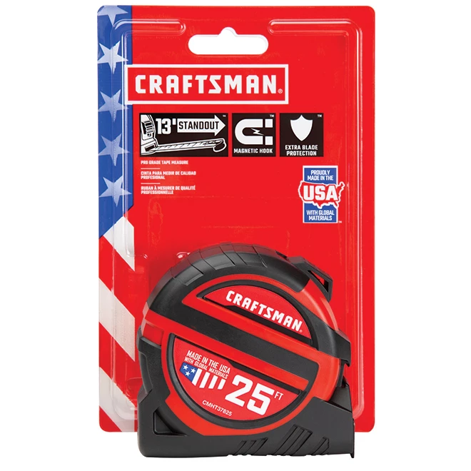 The 25′ (7.62 m) Craftsman® features 13′ (3.35 m) of standout for a professional grade performance. The extra tough blade coating with 3” of BladeArmor protection near the hook to extend its life. Use the magnetic hook with metal studs, conduits, pipes and other ferrous surfaces.
