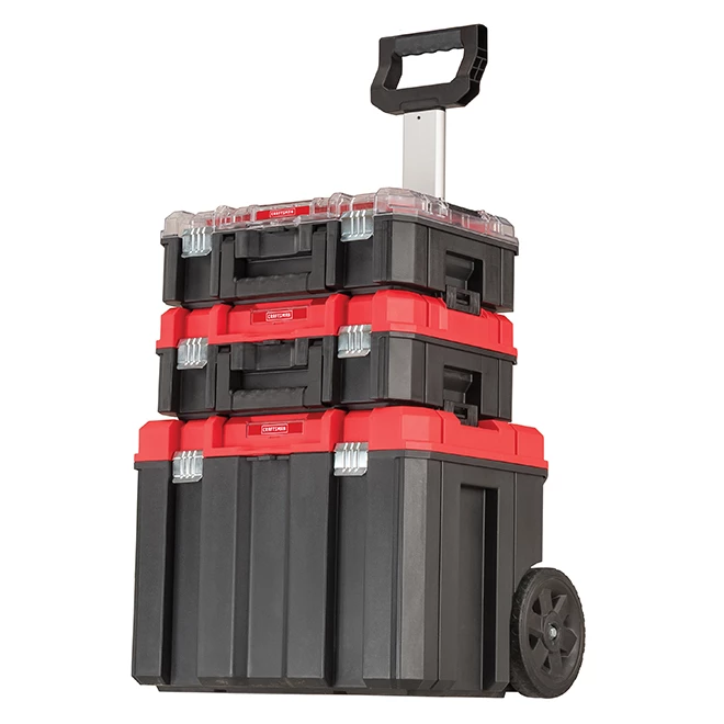 A convenient storage unit that can follow you anywhere you go? That is precisely what this Craftsman(R) portable storage tower is offering! Made of durable, heavy duty plastic, it features three stackable storage boxes that are connected by durable side latches. Making it easy to access its content and to organize it, this set of three storage chests is equipped with a handle and large wheels, which helps to easily transport heavy loads to your job site. Backed by a limited lifetime warranty.