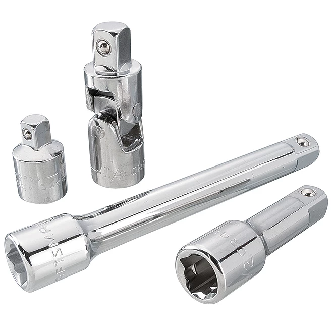 The Craftsman® 1/2” (13 mm) drive accessory mechanic tool set features large markings for quick accessory identification and a chrome finish fully polished ensuring corrosion resistance. The kit includes (1) adapter that allows the use of one driver with multiple drive size sockets. (1)1/2” drive size adapter à 3/8” (2) prise 1/2” rallonges de 3” et 6” et (1) 1/2” drive universal joint. This product is backed by a lifetime full warranty with hassle-free replacement.