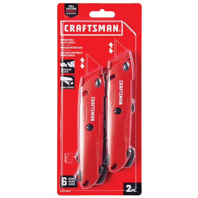 This utility knife by Craftsman® is equipped with a push button that allows tool-free blade change as well as a swing-out blade storage for easy access to replacement blades. Also, the integrated string cutter is designed to allow use even when the blade is retracted. Includes 2 knifes and 6 utility blades. This product is backed by a limited lifetime warranty.