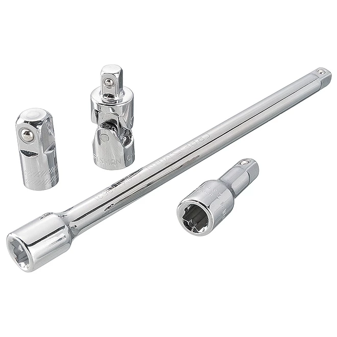 This accessory set by Craftsman® features a polished full chrome finish for corrosion resistance and large markings to help you quickly identify the sizes you are looking for. These meet or exceed ASME specifications. Set includes (1) 3/8″ adapter, (2) extension bars: 1 1/2″ and 6″, and (1) universal joint. This product is backed by the Craftsman® full lifetime warranty.