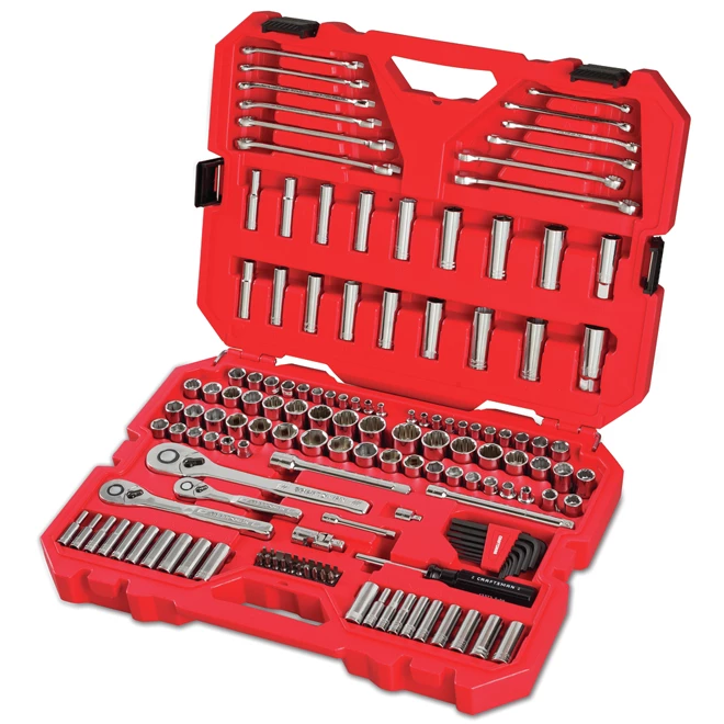 This mechanic-style set features 159 SAE and metric 1/4″ – 3/8″ parts for all your household and automotive needs. Each socket has large markings for a quick size identification. The 72-tooth ratchet offers minimal arc swing when fastening, while the hex sockets offer increased torque with the fastener. Sockets are covered with a fully polished chrome finish for superior corrosion resistance. Furthermore, a compact and molded storage case makes it easy to transport tools and gives them an exceptional durability. In addition to ratchet drivers, this kit includes 22 shallow 1/4″ sockets, a 1/4″ x 3″ driver extension bar, a 1/4″ bit driver, 20 deep 1/4″ sockets, 23 shallow 3/8″ sockets, 8 deep 3/8″ sockets and 2 driver spark plug sockets. This set comes with Craftsman’s full lifetime warranty.
