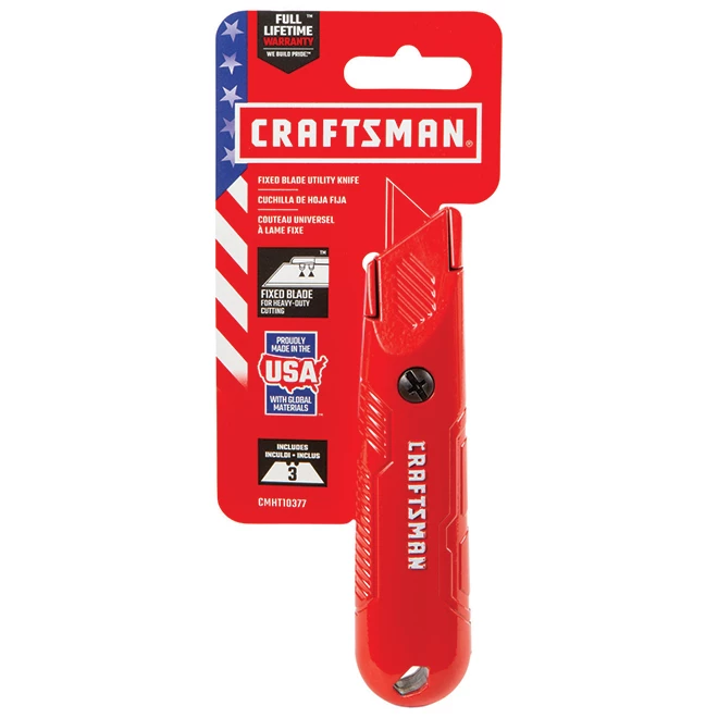 This 5 1/2″ (14 cm) fixed blade knife by Craftsman® offers a strong blade retention system, allowing for safe and efficient heavy-duty cutting. Also, the textured handle is designed for long use and increased durability, while the nose overlaps at the top and bottom grant it added strength. Includes 3 utility blades. This product is backed by a limited lifetime warranty.